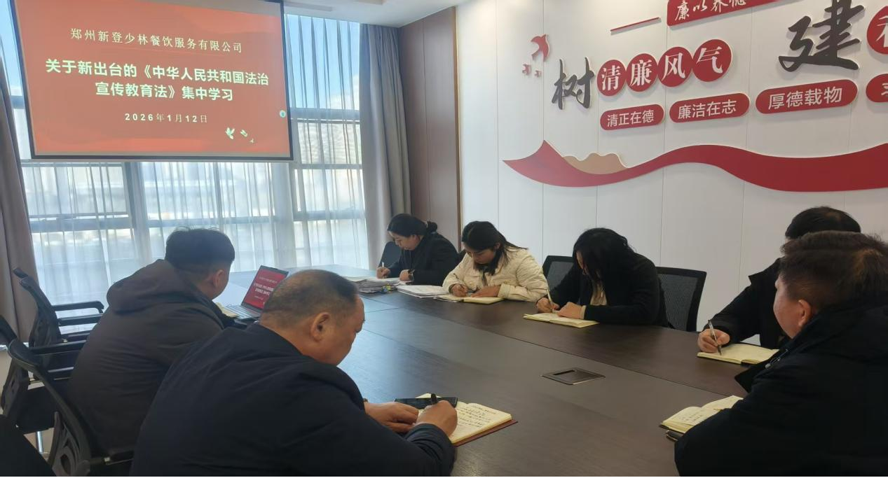 2026年1月12日,郑州新登少林餐饮服务有限公司组织全体中层管理人员及平台工作人员集中学习《中华人民共和国法治宣传教育法》。本次学习由公司总经理主持,旨在通过系统解读、专题研讨,推动中层管理人员准确把握法律核心要义,将法治思维深度融入食材采购、后厨管理、餐食供应、平台供应商管理等全业务流程。